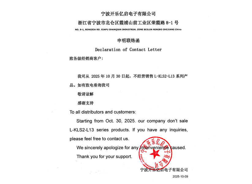 KLS Declaration and Contact Letter 2025-10-09 10:20:53 No Comments liping Company News / Blog KLS Declaration and Contact Letter.PDF Share: PREV: KLS In Russian Moscow Electronics Show. (Time:11~13 APRIL.2023) RELATED POSTS
